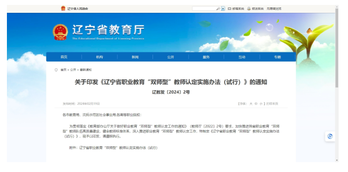 近日,辽宁省教育厅发布关于印发《辽宁省职业教育“双师型”教师认定实施办法(试行)》的通知, 为贯彻落实《教育部办公厅关于做好职业教育“双师型”教师认定工作的通知》(教师厅〔2022〕2号)要求,加快推进我省职业教育“双师型”教师队伍高质量建设,健全教师标准体系,深入推进职业教育“双师型”教师认定工作,特制定《辽宁省职业教育“双师型”教师认定实施办法(试行)》