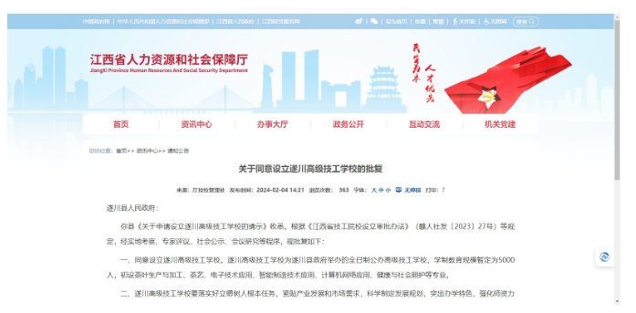 你县《关于申请设立遂川高级技工学校的请示》收悉。根据《江西省技工院校设立审批办法》(赣人社发〔2023〕27号)等规定,经实地考察、专家评议、社会公示、会议研究等程序,现批复如下: