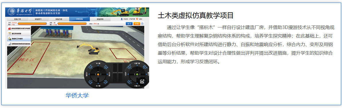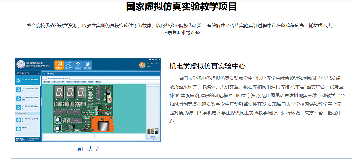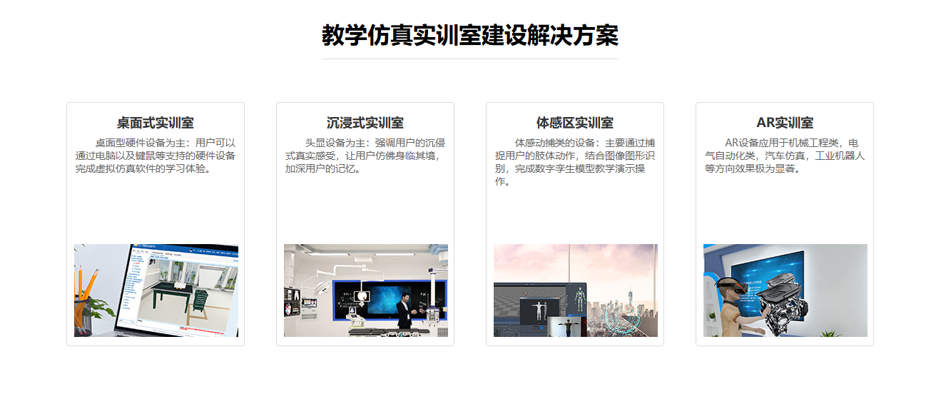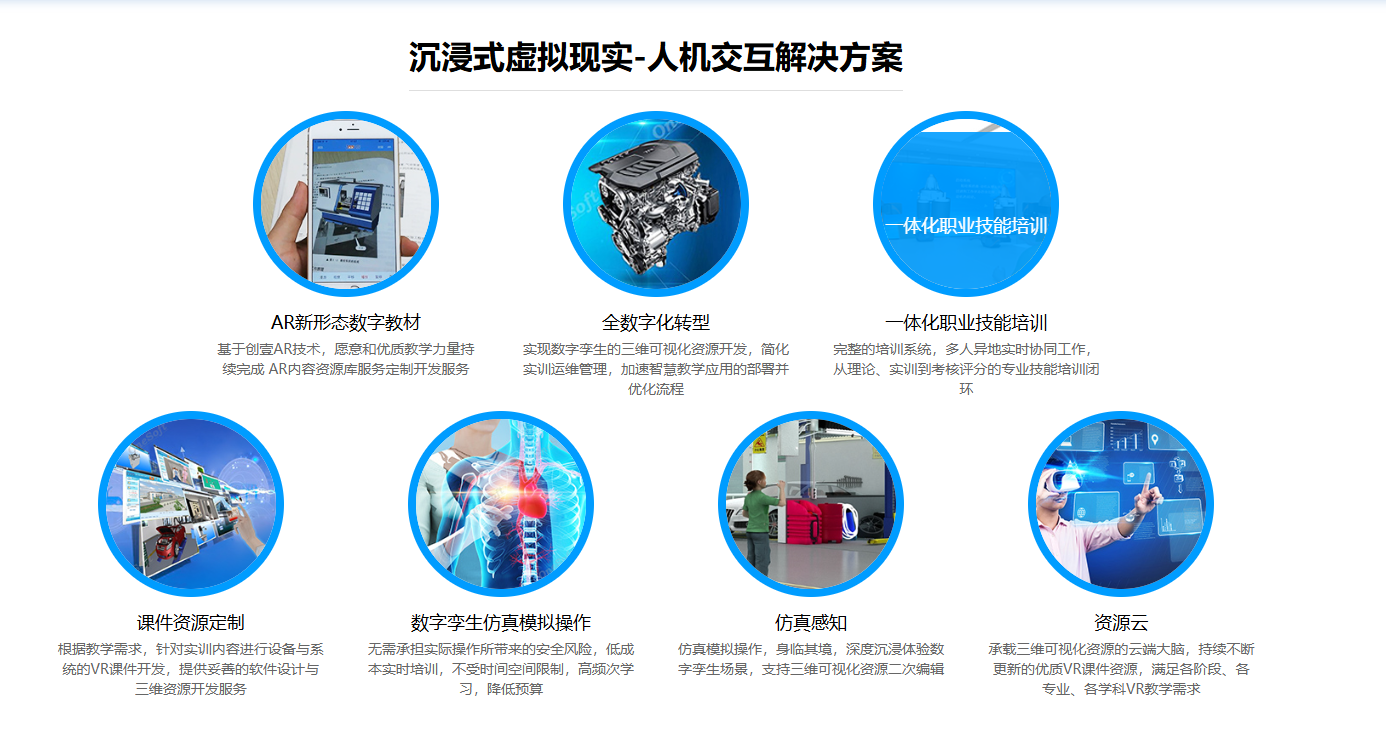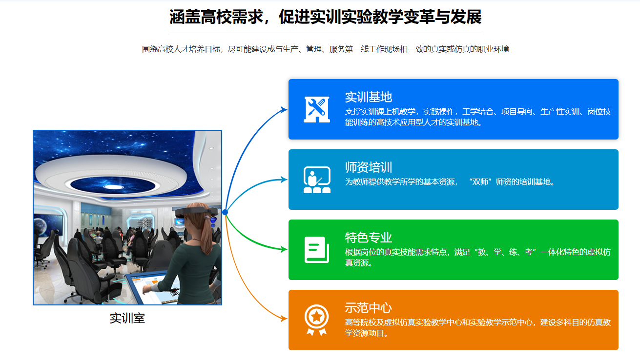 升级传统教学方式,拓展实验教学内容广度和深度;降低实操训练时的损耗,创新教学模式、丰富教学资源、智慧管控教学、体验高仿真实验环境。以高校各学科教学需求而定制开发的教学课件内容为载体,打造软硬件一体及实训环境结合的综合实训产品体系,让老师教学互动更高效,学生学习更直观有趣。