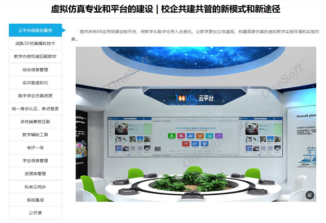 基于凤凰创壹虚拟现实数字孪生互动引擎运行的网络VR仿真实验数字孪生互动环境,能够实现大量并行用户快速下载及构建渲染动态数字孪生互动场景,确保用户与数字孪生场景互动的即时性,具有开放性、扩展性、兼容性、前瞻性的110个专业大类700多门VR/AR/MR数字孪生仿真教学培训课程及800多万个数字孪生仿真实训/考核资源于一体的数字孪生仿真实验教学管理和共享平台。